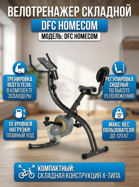 Велотренажер DFC X-Bike B3386R - ОписаниеВелотренажер DFC Homecom - это удобный тренажер для дома, который позволяет тренировать мышцы ног и сердечно-сосудистую систему. Максимальный вес пользователя составляет 120 кг. В комплекте с тренажером идут эспандеры, которые позволяют дополнительно работать с мышцами рук.