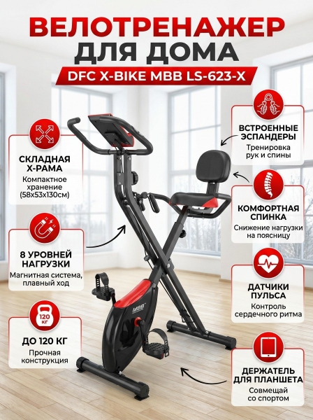 Велотренажер DFC X-Bike MBB LS-623-X - ОписаниеСомневаетесь? - Посмотрите рейтинг ТОП-10 по категории «Домашние велотренажеры»Велотренажёр DFC X-Bike MBB LS623X со спинкой подходит для пользователей весом до 120 килограмм. Он имеет складную конструкцию, что облегчает хранение и транспортировку.