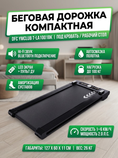 Беговая дорожка DFC YMCLUB T-LA1001BK - ОписаниеСомневаетесь? - Посмотрите рейтинг ТОП-10 по категории «Домашние беговые дорожки»Беговая дорожка LA1001 YMCLUB чёрного цвета — идеальный выбор для тех, кто ценит комфорт и эффективность тренировок. Благодаря отсутствию поручней и максимальной компактности, она легко поместится даже в небольшом пространстве. Пульт управления работает от 1 батарейки CR2025 (не входит в комплект).