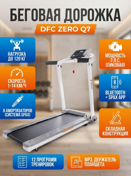 Беговая дорожка DFC ZERO T-ZT-Q7 - ОписаниеСомневаетесь? - Посмотрите рейтинг ТОП-10 по категории «Домашние беговые дорожки»Беговая дорожка DFC ZERO Q7 — отличный выбор для домашних тренировок. Эта модель поддерживает приложение SPAX и подходит для пользователей ростом от 140 см.