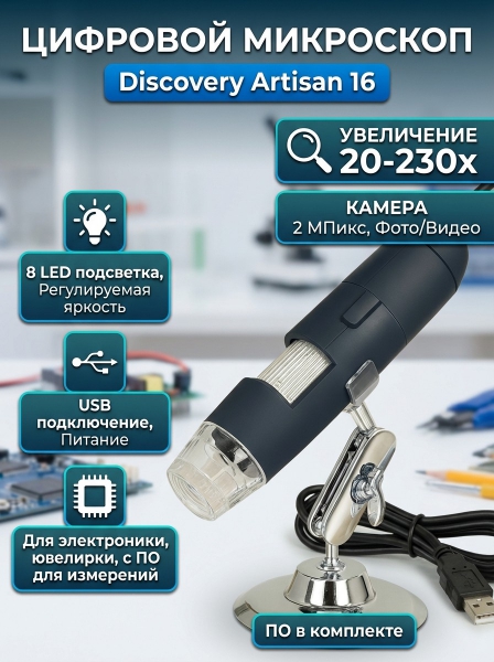 Микроскоп цифровой Discovery Artisan 16 - ОписаниеЦифровой микроскоп Discovery Artisan 16 прекрасно подходит для изучения монет, работы с металлами, ремонта электроники, оценки качества заточки ножей, а также реставрации предметов искусства и узкоспециализированных исследований в прикладных науках. Микроскоп можно использовать как на штативе, так и без него. Прибор работает в паре с компьютером: выводит картинку на внешний экран, также позволяет фотографировать, записывать видео и проводить линейные и угловые измерения.