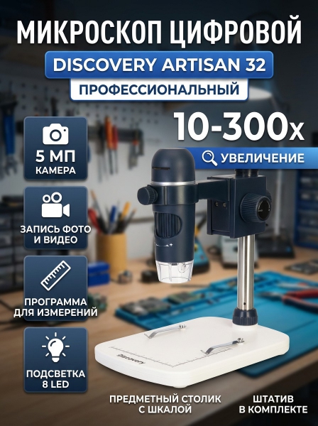 Микроскоп цифровой Discovery Artisan 32 - ОписаниеDiscovery Artisan 32 – это цифровой USB-микроскоп с профессиональным штативом. Прибор прекрасно подойдет для выполнения профессиональных задач нумизмата, мастера сервисного центра, ювелира, часового мастера, реставратора, также его можно использовать для разных хобби.