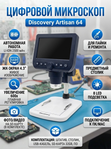 Микроскоп цифровой Discovery Artisan 64 - ДоставкаДоставка по Санкт-Петербургу: бесплатно, 2-3 дня Доставка по России: стоимость уточняйте у оператора. Микроскоп цифровой Discovery Artisan 64 - Отзывы0.0