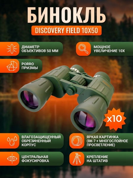 Бинокль для охоты и рыбалки Discovery Field 10x50 - БрендСтрана бренда: США Премиальность бренда:Посмотреть все бинокли для туризма и путешествий Discovery (4) Бинокль для охоты и рыбалки Discovery Field 10x50 - Характеристики