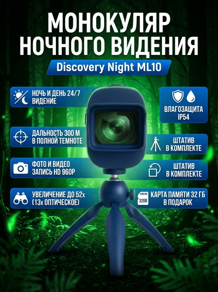 Монокуляр цифровой ночного видения Discovery Night ML10 со штативом - ОписаниеМонокуляр ночного видения Discovery Night ML10 с цифровым и оптическим увеличением и встроенным рекордером. Прибор можно применять не только ночью, но и днем – как обычный монокуляр. В дневное время картинка будет цветной, в ночное – черно-белой. Монокуляр будет незаменим в походе и на ночной охоте, также его можно использовать для спортивного ориентирования и тактических игр в полевых условиях. Пригодится он и для выполнения профессиональных задач по охране территорий.