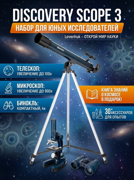 Набор телескоп+микроскоп+бинокль. Discovery Scope 3 с книгой - ОписаниеВ набор Discovery Scope 3 входят три оптических прибора для начинающих пользователей: биологический микроскоп с нижней подсветкой, телескоп на полноразмерной треноге и компактный бинокль. Также в комплект включены более 30 аксессуаров и книга знаний «Космос. Непустая пустота».