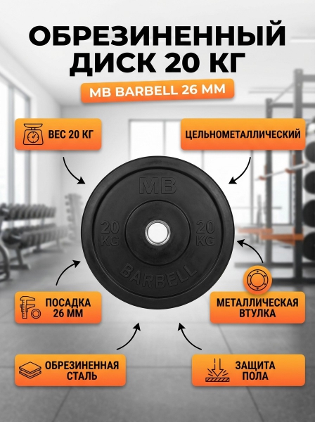 Диск обрезиненный MB Barbell MB-PltB26-20 - БрендMB Barbell – это торговая марка, представляющая специализированное и высококачественное оборудование для оснащения спортивных залов.