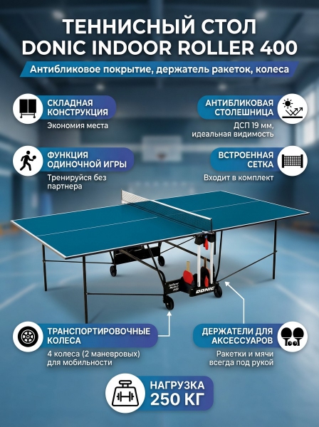Теннисный стол Donic Indoor Roller 400 синий - ДоставкаДоставка по Санкт-Петербургу: бесплатно, 2-3 дня Доставка по России: стоимость уточняйте у оператора. Теннисный стол Donic Indoor Roller 400 синий - Отзывы5.0