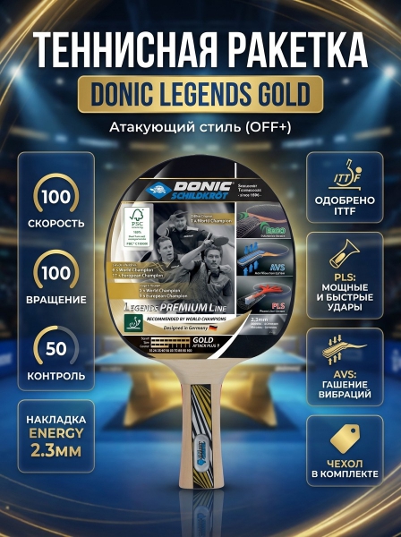 Теннисная ракетка Donic Legends Gold - ОписаниеРакетка "LEGENDS GOLD" из премиальной линейки DONIC рассчитана на тип игры Атака+. В комплекте с LEGENDS GOLD идёт чехол по форме ракетки. Для покрытия используется накладка Energy, а толщина губки 2,3 мм. Форма ручки Concave - ручка, расширяющаяся к концу. Ракетка одобрена Международной федерацией настольного тенниса ITTF.