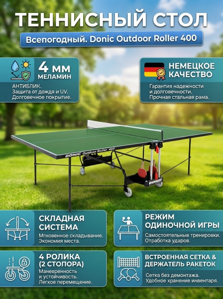 Теннисный стол Donic Outdoor Roller 400 зеленый - БрендНемецкий бренд Donic представляет широкий ассортимент спортивного инвентаря, одежды и аксессуаров для настольного тенниса.