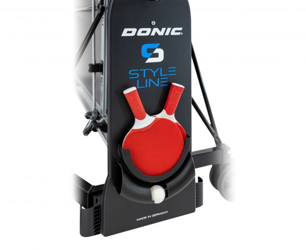 Для удобного хранения ракеток и мячей предусмотрен специальный держатель, который входит в комплект поставки. Стол оснащен четырьмя прорезиненными двойными роликами с плавным ходом диаметром 128 мм, которые обеспечивают легкое перемещение стола.