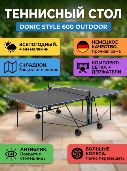 Теннисный стол Donic Style 600 Outdoor серый - ДоставкаДоставка по Санкт-Петербургу: бесплатно, 2-3 дня Доставка по России: стоимость уточняйте у оператора. Теннисный стол Donic Style 600 Outdoor серый - Отзывы0.0
