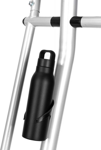 Эллипсоид устойчиво стоит благодаря компенсаторам неровности пола, легко перемещается на транспортировочных роликах, а подставка под планшет и держатель для бутылки позволяют держать всё необходимое под рукой.
