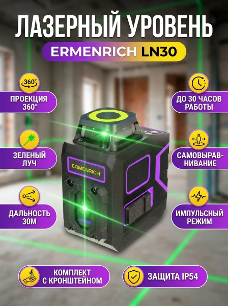 Лазерный уровень Ermenrich LN30 фиолетовый - ОписаниеЛазерный уровень Ermenrich LN30 – простой в обращении прибор, который будет полезен на стройплощадке, в ремонтируемой квартире или при работах на земельном участке. Он формирует 5 линий: 4 в горизонтальной плоскости и 1 в вертикальной. Угол развертки по горизонтали составляет полные 360° – это отлично подходит для заливки пола, укладки плитки и других видов работ. Встроенный механизм компенсации вибраций отвечает за самовыравнивание лазерных лучей и помогает произвести все операции максимально точно.