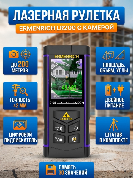 Лазерная рулетка с камерой Ermenrich LR200 - ОписаниеErmenrich LR200 – лазерная рулетка с цифровым видоискателем, которая позволит проводить замеры на удалении до 200 м. Прибор способен оценивать не только линейные расстояния, но и площадь, объемы и углы с минимальной погрешностью (±2 мм). Оптимизация процесса измерений на стройке, при ремонте или проектировании с такой рулеткой выходит на новый уровень.