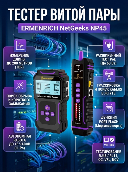 Многофункциональный кабельный тестер Ermenrich NetGeeks NP45 - ДоставкаДоставка по Санкт-Петербургу: бесплатно, 2-3 дня Доставка по России: стоимость уточняйте у оператора. Многофункциональный кабельный тестер Ermenrich NetGeeks NP45 - Отзывы0.0