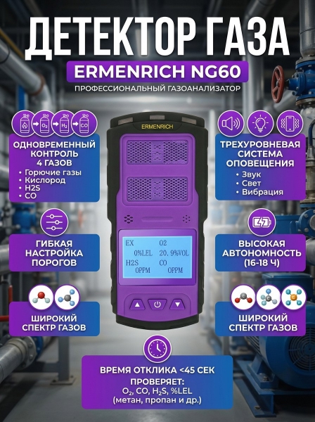Детектор газа Ermenrich NG60, фиолетовый - ОписаниеErmenrich NG60 – современный портативный газоанализатор, необходимый для обеспечения безопасности на производстве, в промышленности или в быту. Он определяет присутствие и концентрацию горючих газов, таких каких как водород, окись углерода, метана, бутана, пропана и многих других.