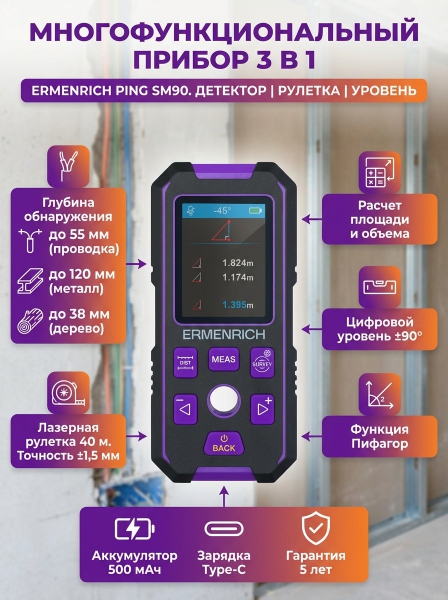 Детектор скрытой проводки Ermenrich Ping SM90, фиолетовый - ОписаниеErmenrich Ping SM90 – многофункциональное устройство для обнаружения скрытых проводов под напряжением, труб, деревянных и металлических конструкций, а также для измерения длины и уровня. Детектор показывает наличие проводов на глубине до 55 мм, конструкций на глубине до 38 мм. Черные металлы обнаруживаются не глубже 100 мм, цветные – 120 мм. Тестер можно использовать как для домашнего ремонта, так и для профессиональных строительно-монтажных работ.