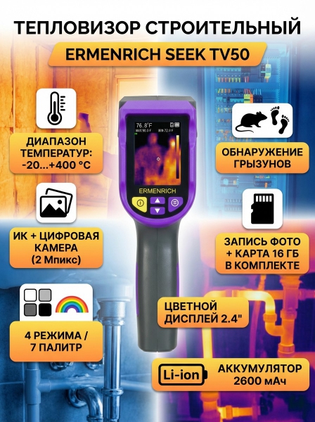 Тепловизор строительный Ermenrich Seek TV50, фиолетовый - ДоставкаДоставка по Санкт-Петербургу: бесплатно, 2-3 дня Доставка по России: стоимость уточняйте у оператора. Тепловизор строительный Ermenrich Seek TV50, фиолетовый - Отзывы0.0
