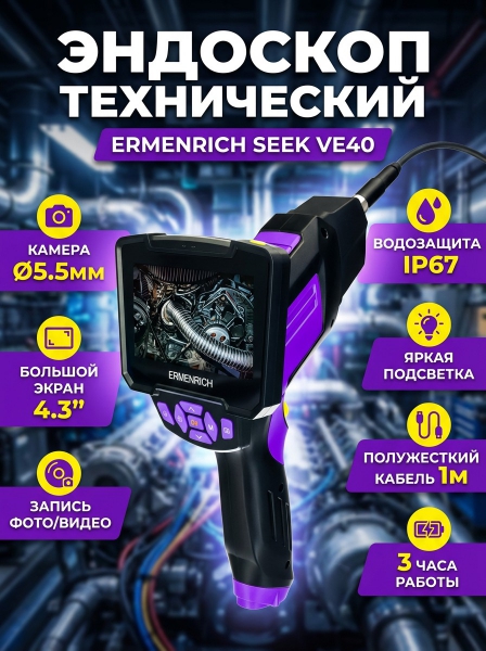Видеоэндоскоп Ermenrich Seek VE40, фиолетовый - ОписаниеТехнический эндоскоп Ermenrich Seek VE40 предназначен для осмотра трудноступных мест при ремонте трубопроводов и систем вентиляции, обслуживании промышленного оборудования и автомобилей, строительстве зданий. Эндоскоп оснащен цветным ЖК-дисплеем с диагональю 4,3". На полужестком кабеле расположена камера для фотосъемки в качестве 1280x720 пикс и записи видео в качестве 640x480 пикс.