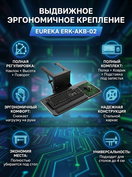 Крепление для клавиатуры с регулировкой Eureka ERK-AKB-02 - ОписаниеГладкая поверхность с текстурой из углеродного волокна соответствует нашим самым популярным моделям игровых столов и совместима со всеми столами Eureka. Эргономичная подставка для клавиатуры Eureka включает в себя подставку для запястий и коврик для игровой мыши на всю поверхность. Регулируемая подставка для игровой клавиатуры Eureka Ergonomic — самая удобная и эргономичная подставка для клавиатуры, и точка! Попробуйте сами. Полностью регулируемая подставка для клавиатуры, ее можно поворачивать влево или вправо, наклонять под углом вверх или вниз, а также регулировать по высоте. Регулируемая подставка для клавиатуры Eureka Ergonomic полностью убирается под игровой стол, когда вы хотите, чтобы она не мешал, когда вам нужно приблизиться к монитору.