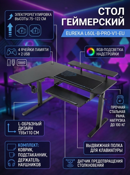 Стол для для компьютера Eureka ERK-L60L-B-PRO-V1-EU - ОписаниеСомневаетесь? - Посмотрите рейтинг ТОП-10 по категории «Геймерские столы»Угловой компьютерный стол Eureka L60 Gaming Desk c электрической регулировкой по высоте - идеальный выбор тех, кому необходимо расширенное пространство для работы. L60 имеет 60-дюймовую столешницу с гладким покрытием в стиле натуральной деревяной доски. На столе Eureka L60 можно с лёгкостью разместить несколько мониторов и необходимые девайсы для осуществления вашей деятельности. А такие решения по организации пространства, как надстройка для монитора и подставка под клавиатуру увеличат рабочее пространство минимум на 25%ю Стол регулируется по высоте и не вибрирует при подъёме/опускании, благодаря плавному пуску/остановке. Улучшенный многофункциональный контроллер с передней стороны стола имеет 2 USB порта и может хранить 4 предварительно запрограммированных высоты. А интеллектуальный датчик предотвращения столкновений Eureka был специально разработан для обеспечения безопасности объектов вокруг вашего стола при изменении высоты. Вам не надо волноваться о том, что стол столкнется с принтером или офисным шкафом, датчик защиты от столкновений не позволит столу ударить предметы вокруг стола. А благодаря специальной системе управления кабелями, на вашем столе никогда не будет запутанных проводов.
