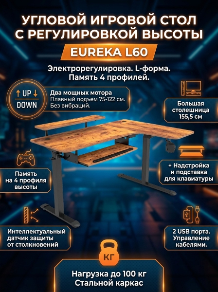 Угловой компьютерный стол Eureka ERK-L60R-RB (правый) - ОписаниеСомневаетесь? - Посмотрите рейтинг ТОП-10 по категории «Геймерские столы»Угловой компьютерный стол Eureka L60 Gaming Desk c электрической регулировкой по высоте - идеальный выбор тех, кому необходимо расширенное пространство для работы. L60 имеет 60-дюймовую столешницу с гладким покрытием в стиле натуральной деревянной доски. На столе Eureka L60 можно с лёгкостью разместить несколько мониторов и необходимые девайсы для осуществления вашей деятельности.