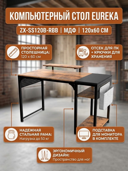 Стол для компьютера Eureka ZX-SS120B-RBB Brown - ОписаниеСтол для компьютера EUREKA ZX-SS120B-RBB - это идеальное решение для офиса или квартиры. Обеспечивает достаточно места для монитора и компьютера. Поставляется не только со специальным отсеком для системного блока, но и оснащен досками с несколькими крючками с двух сторон, чтобы держать все важные вещи под рукой.