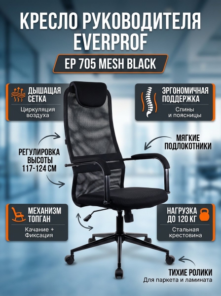 Кресло компьютерное Everprof EP 705 - ОписаниеСомневаетесь? - Посмотрите рейтинг ТОП-10 по категории «Ортопедические кресла»Кресло для руководителя EP 705, сетка черного цвета.