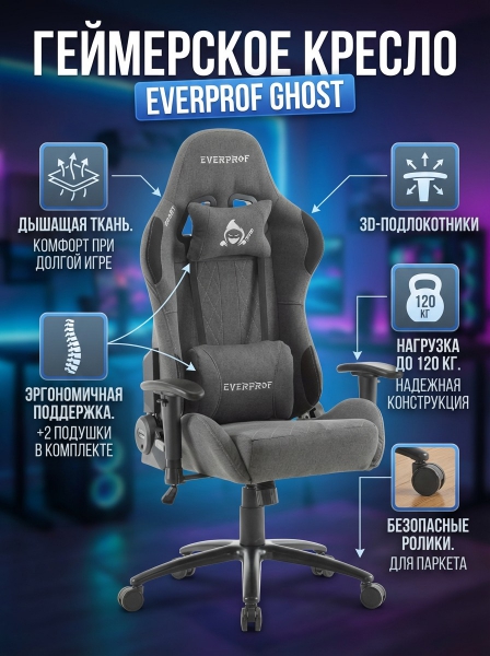 Геймерское кресло Everprof Ghost ткань, серый - ДоставкаДоставка по Санкт-Петербургу: бесплатно, 2-3 дня Доставка по России: стоимость уточняйте у оператора. Геймерское кресло Everprof Ghost ткань, серый - Отзывы0.0