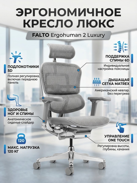 Эргономичное кресло класса люкс Falto Ergohuman 2 Luxury сетка , серый - ДоставкаДоставка по Санкт-Петербургу: бесплатно, 2-3 дня Доставка по России: стоимость уточняйте у оператора. Эргономичное кресло класса люкс Falto Ergohuman 2 Luxury сетка , серый - Отзывы0.0