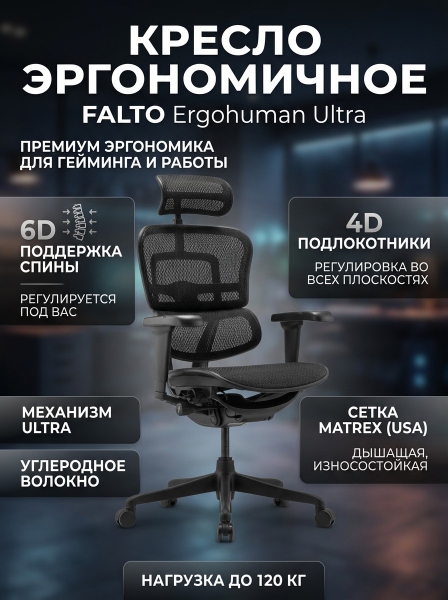 Кресло эргономичное Falto Ergohuman Ultra (чёрный каркас/сетка) - Обзор ТОП-10 лучших ортопедических кресел 2025 🏆: Обзор и рейтинг