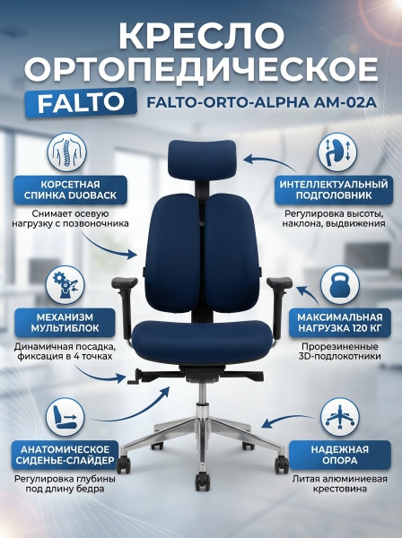 Кресло ортопедическое Falto FALTO-ORTO-ALPHA AM-02A - ОписаниеСомневаетесь? - Посмотрите рейтинг ТОП-10 по категории «Ортопедические кресла»Профессиональное ортопедическое кресло Falto-ORTO олицетворяет собой высококачественную эргономику, лучшие ортопедические решения, оригинальный, экстраординарный дизайн, незабываемое удобство и главное, заботу о здоровье. Регулируемый по высоте и углу наклона подголовник. Подголовник имеет выдвижение вперёд 10 см. от оси кронштейна спинки. Это выдвижение позволяет комфортно положить голову. Регулировка по высоте 10 см в совокупности с изменением по высоте общего кронштейна спинки позволяет настроить под ростовые параметры пользователя. Настраиваемая подушка подголовника по углу наклона позволяет создать правильную поддержку головы. Обивка подголовника ткань. Внутреннее наполнение слой ППУ. Ортопедическая корсетная спинка DUOBACK с регулировкой по высоте и ширине. Эластичный корсет удерживает спину пользователя в физиологически правильном положении и снимает осевую нагрузку. Обеспечивает максимальный комфорт при многочасовой работе. Наполнение крыльев спинки ППУ высокой плотности. Обивка эластичная ткань. Регулировка спинки кресла по высоте для полного анатомического соответствия владельцу кресла. Крылья спинки двигаются по ширине для достижения размера спинки совпадающего с размером спины пользователя. Сидение с наполнением высокой плотности, регулируется по глубине – механизм «слайдер». Форма сидения анатомическая. Наполнение с высокой степенью терморегуляции, обладает микроперфорацией для свободного воздухообмена. Основание формованный ABS пластик. Обивка высокопрочная эластичная ткань. 3D подлокотник. Изменение по высоте позволяет настроить оптимальную поддержку плеча пользователя. Верхняя площадка прорезинена. Возможно выдвижение вперёд. Кронштейн подлокотника рассчитан на рабочую нагрузку в 75 кг. Тип механизма кресла Мультиблок. Принцип движения асинхронный. Механизм качания с индивидуальной настройкой под вес пользователя. Фиксация в 4 точках отклонения. Подбор глубины сидения–«слайдер». Опорная крестовина для ортопедического кресла Falto-ORTO, пятилучевая, литая из высокопрочного алюминия. Металлические крестовины всегда выделялись дизайном и надёжностью. Внешний вид кресла напрямую зависит от его подножья, с алюминиевой крестовиной кресло выглядит надёжно, дорого и стильно. Лучи крестовины выдерживают 110 кг на излом.