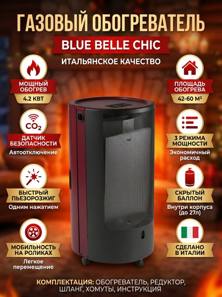 Газовый обогреватель каминного типа TMC BLUE BELLE CHIC - ОписаниеГазовый обогреватель Blue Belle Chic каминного типа имеет современный дизайн и легко впишется в любой, даже самый изысканный интерьер вашего дома. В обогревателе баллон размещён в специальном отделении с дверцей, благодаря чему обогреватель смотрится стильно и гармонично. Мобильность устройству придаёт наличие роликов, которые обеспечивают удобное размещение в интерьере. Конвективный метод обогрева основывается на циркуляции воздуха, достигающейся за счёт разницы в температуре потоков: тёплый воздушный поток поднимается вверх, а холодный наоборот — стремится вниз. Встроенный анализатор атмосферы контролирует процентное содержание СО2 в помещении и выключает обогреватель при превышении нормы, которая составляет 1,5%. Каждый обогреватель Blue Belle Chic пред упаковкой проходит испытания на специальном стенде, тем самым гарантирует максимальную безопасность во время использования.
