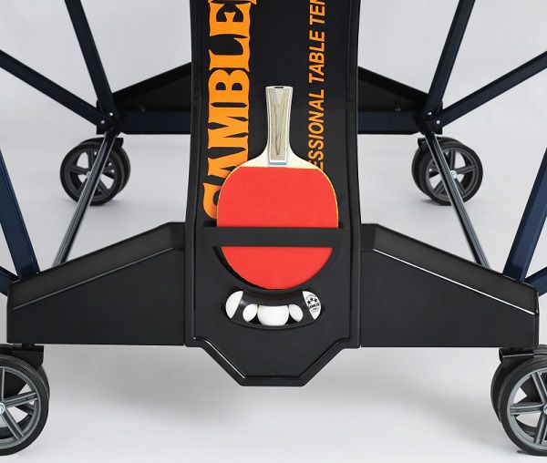 Восемь прорезиненных колес обеспечивают плавную маневренность и комфортную транспортировку стола. Оснащен боковыми накладками для хранения ракеток и мячей.