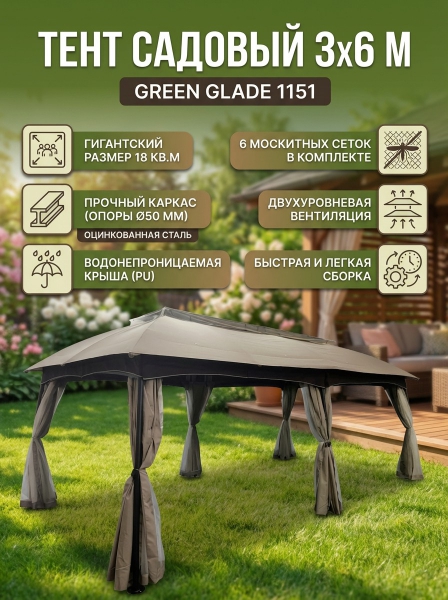 Тент садовый Green Glade 1151 3х6 м - БрендСтрана бренда: Россия Премиальность бренда:Посмотреть все палатки-шатры для дачи и отдыха Green Glade (40) Тент садовый Green Glade 1151 3х6 м - Характеристики
