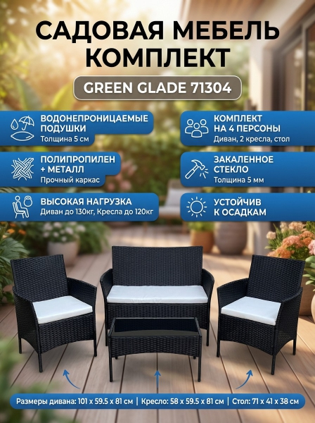 Комплект садовой мебели Green Glade 71304 - ДоставкаДоставка по Санкт-Петербургу: бесплатно, 2-3 дня Доставка по России: стоимость уточняйте у оператора. Комплект садовой мебели Green Glade 71304 - Отзывы0.0