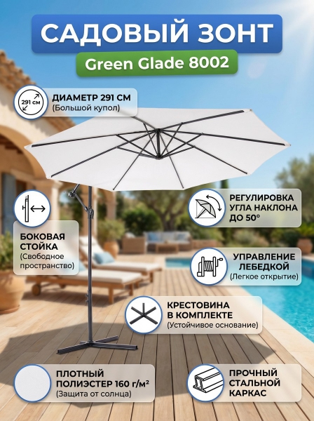 Садовый зонт Green Glade 8002 - ОписаниеБольшой зонт Green Glade – незаменим для отдыха на даче, загородном участке и около бассейна. Он защитит вас и ваших детей от яркого солнца и создаст комфортную тень.