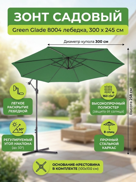 Зонт садовый Green Glade 8004 зеленый - ОписаниеСомневаетесь? - Посмотрите рейтинг ТОП-10 по категории «Садовые зонты»Большой зонт Green Glade – незаменим для отдыха на даче, загородном участке и около бассейна. Он защитит вас и ваших детей от яркого солнца и создаст комфортную тень. Купол зонта легко открывается с помощью лебедки. Благодаря боковому расположению стойки под куполом можно установить любую пластиковую мебель: от шезлонга до обеденного стола. В комплекте с зонтом идет основание – крестовина, на которую для устойчивости можно установить бетонные утяжелители (в комплект не входят) или привернуть ее через имеющиеся отверстия к полу.