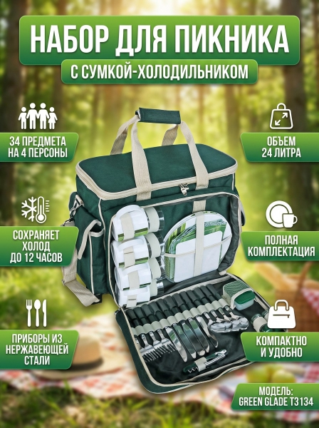 Набор для пикника Green Glade T3134 (34 предмета) - ОписаниеНабор для пикника Т3134 - это комплект посуды для 4 персон, транспортируемый в сумке-холодильнике, которая поддерживает низкую температуру продуктов в течении 12 часов. Ножи, вилки и ложки изготовлены из нержавеющей стали. Тарелки, бокалы сделаны из пищевого пластика, который не оказывает вредного воздействия на здоровье человека. Данный набор прекрасно подойдет для проведения отдыха на природе.