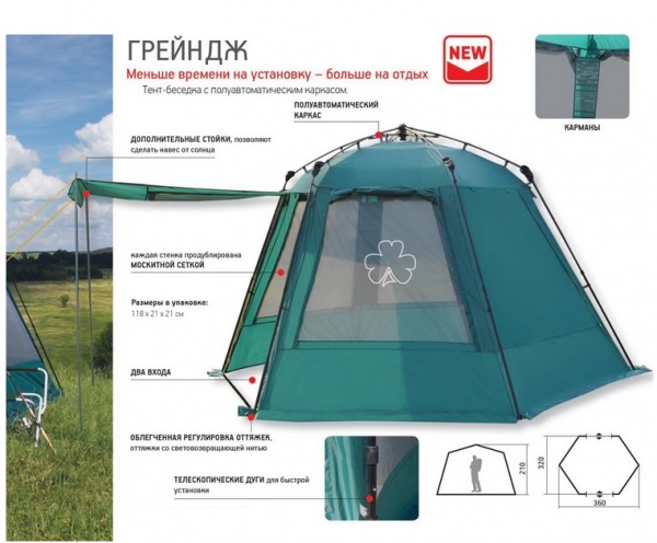 Тент-беседка с полуавтоматическим каркасом, телескопическими дугами для быстрой установки, двумя входами, каждая стенка продублирована москитной сеткой. Водонепроницаемая пропитка поможет защититься не только от солнца, но и от дождя. Дополнительные стойки, позволяют сделать навес от солнца. Облегченная регулировка оттяжек. Оттяжки со световозвращающей нитью.