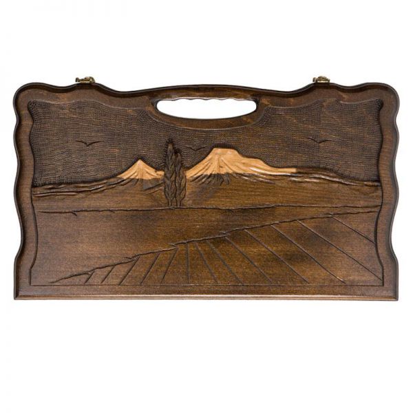 Для внешнего оформления мастер избрал один из главных символов Армении – гору Арарат, чье изображение нанесено на внешнюю сторону. В комплекте идет набор изысканных фишек, оборудованных тканевой подложкой с одной из сторон, что предотвращает появление царапин на доске. Снаружи на одной из сторон разлиновано поле для игры в шашки, которыми можно отвлечься от напряженных партий в нарды. Также прилагается чехол, куда помещается вся доска в сложенном виде и именно так ее лучше всего хранить, если в ближайшее время не планируете играть.