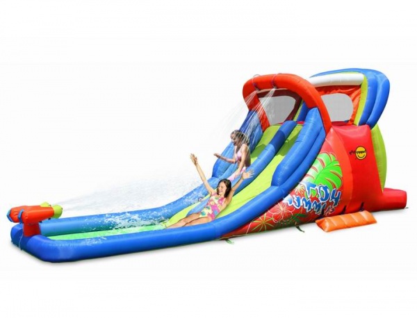 Надувная водная горка Happy Hop Жара - ОписаниеСомневаетесь? - Посмотрите рейтинг ТОП-10 по категории «Детские батуты»Что может быть приятнее для ребенка в жаркий летний день, чем весело кататься с надувной горки в облаке водных брызг? Батут-горка «Жара», выполненная в тропическом дизайне, станет отличным развлечением для детей в теплое время года. Она имеет две полосы для скатывания, позволяющие устроить соревнования, а в конце трассы участников «гонки» ждут надувные пушки, поливающие их водой. Размеры изделия позволяют одновременно пользоваться им четырем-пяти детям в возрасте до 10 лет.