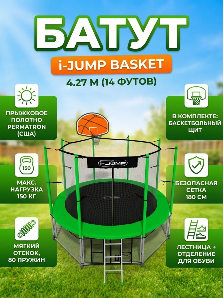 Батут с баскетбольным щитом i-Jump Basket 14ft green - ДоставкаДоставка по Санкт-Петербургу: бесплатно, 2-3 дня Доставка по России: стоимость уточняйте у оператора. Батут с баскетбольным щитом i-Jump Basket 14ft green - Отзывы0.0