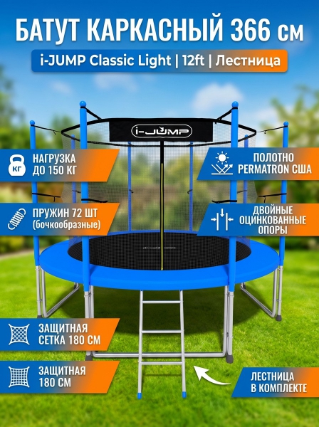 Батут с внутренней сеткой и лестницей i-Jump Classic Light 12ft blue - ДоставкаДоставка по Санкт-Петербургу: бесплатно, 2-3 дня Доставка по России: стоимость уточняйте у оператора. Батут с внутренней сеткой и лестницей i-Jump Classic Light 12ft blue - Отзывы0.0