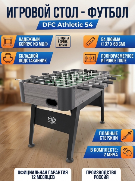 Игровой стол - футбол DFC Athletic 54" 137 х 68 см - ОписаниеСтол идеально подходит для установки в домашних условиях, игровых комнатах или развлекательных центрах. Благодаря качественным материалам и продуманной конструкции обеспечивает комфортный игровой процесс и длительное время службы.