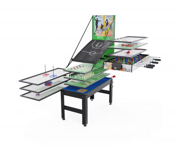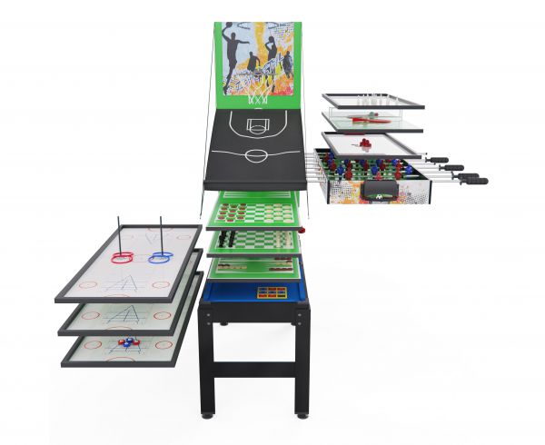 Основные характеристики Размер стола: 122 x 61 см Количество игр: 15 различных игровых поверхностей Материал: Высококачественный износостойкий пластик Конструкция: Трансформируемая игровая поверхность В одном устройстве собраны самые популярные настольные игры и спортивные симуляторы: