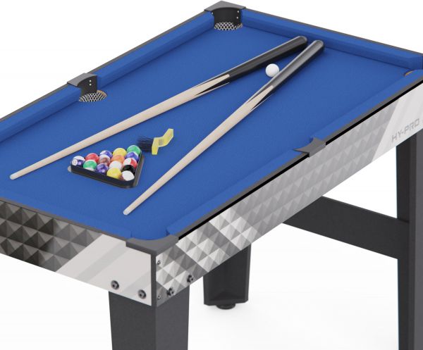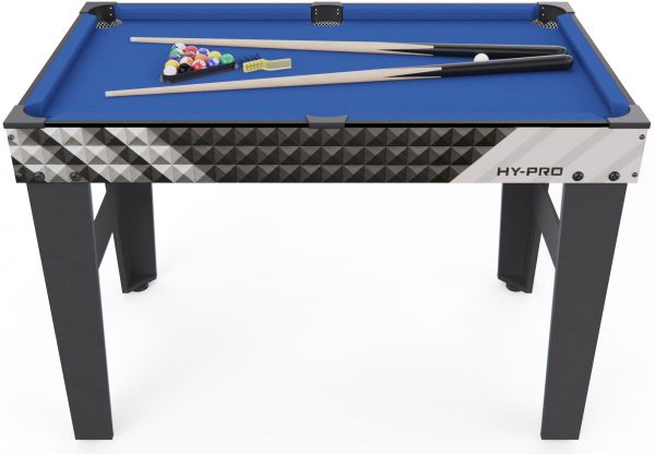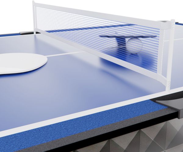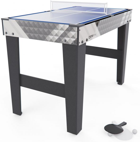 Стол сочетает в себе 4 игровых направления: 1. Бильярд (треугольник, кий, набор шаров, мел) 2. Аэрохоккей (2 биты, шайба) 3. Настольный теннис (2 ракетки, 2 мячика, сетка) 4. Футбол (мяч)