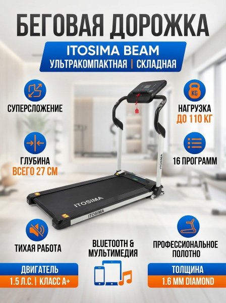 Дизайнерская беговая дорожка Itosima Beam - ОписаниеСомневаетесь? - Посмотрите рейтинг ТОП-10 по категории «Домашние беговые дорожки»Дизайнерская беговая дорожка, занимающая минимум пространства в рабочем виде.