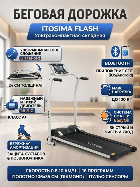 Компактная беговая дорожка Itosima Flash - ОписаниеСомневаетесь? - Посмотрите рейтинг ТОП-10 по категории «Домашние беговые дорожки»Беговая дорожка для дома начального уровня, но с полным набором всех необходимых функций, а также с возможностью ультра компактного складывания. Модель разработана в соответствии с тенденциям в области организации пространства в квартирах. Благодаря уникальному дизайну японских конструкторов дорожка в сложенном виде занимает минимум пространства. Дорожка оснащена мотором оптимальной мощности 1,5 л.с., который позволяет разгонять беговое полотно от 0,8 до 10 км/ч, что оптимально как для ходьбы, так и для бега. Дорожка оснащена системой удобной смазки "Easy Oil". Интуитивно понятная панель управления, благодаря которой Вы можете с легкостью выбрать одну из 16 программ тренировок или настроить дорожку для себя, также можно подключить по протоколу Bluetooth смартфон и тренироваться, используя широкие возможности приложения GFIT.